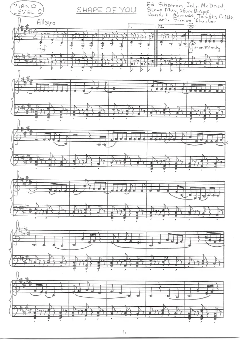 This Level 2 piano arrangement of Shape of You is crafted for early-intermediate pianists who want a modern, flowing piece that’s enjoyable to play. The arrangement keeps the recognisable rhythm and melody while remaining comfortable for developing technique.