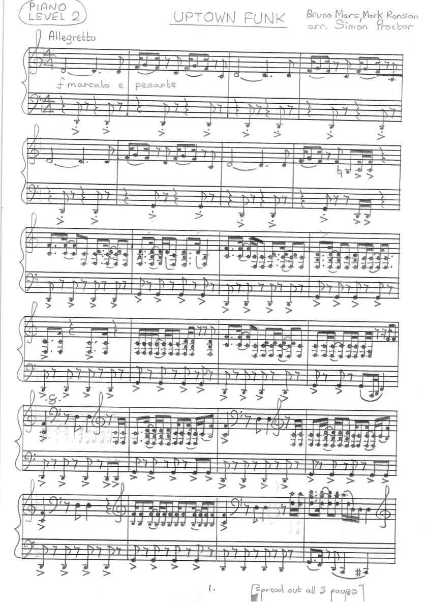 This Level 2 piano arrangement of Up Town Funk is designed for early-intermediate players who want to enjoy a modern, upbeat piece with a strong rhythmic feel. The arrangement keeps the groove and character of the original while remaining accessible and enjoyable to play.